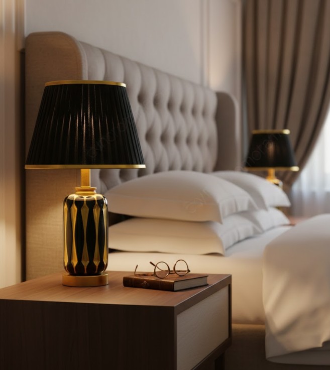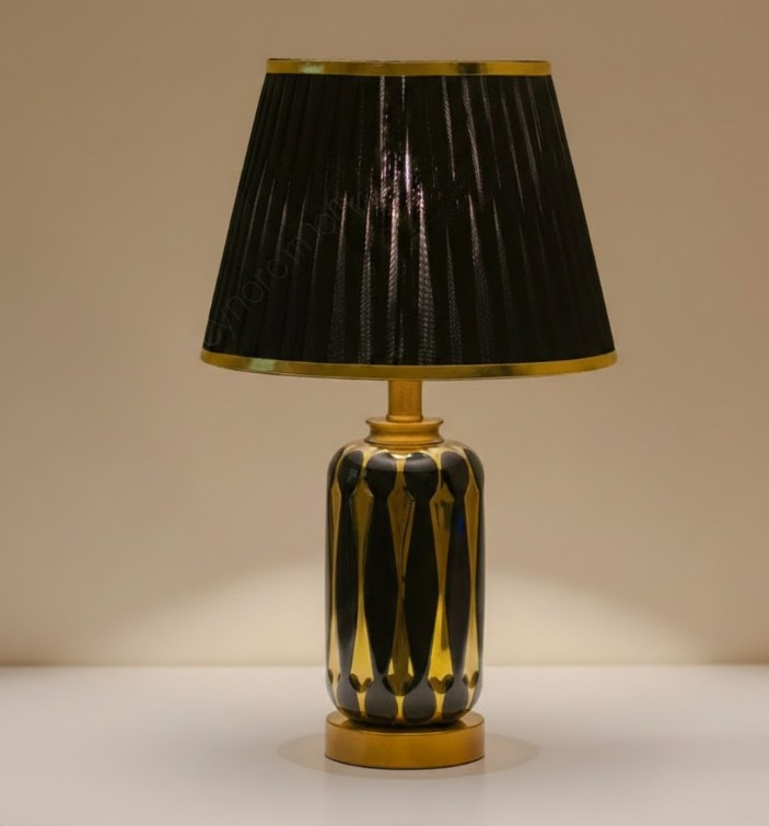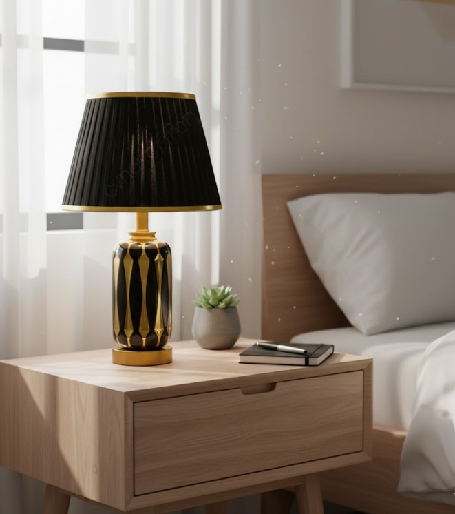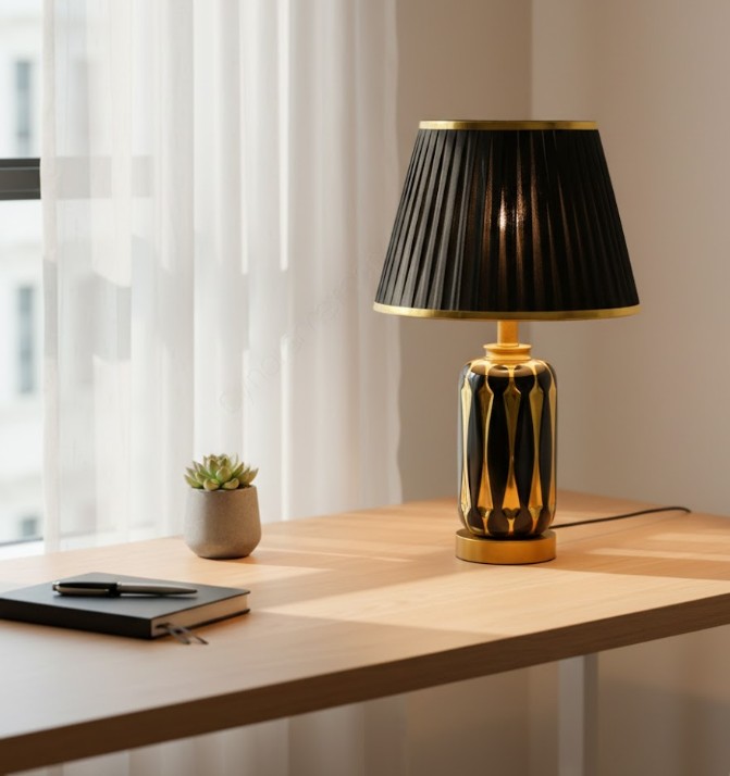 Elegant Color Combination – Black ceramic body with golden metal base and black fabric shade