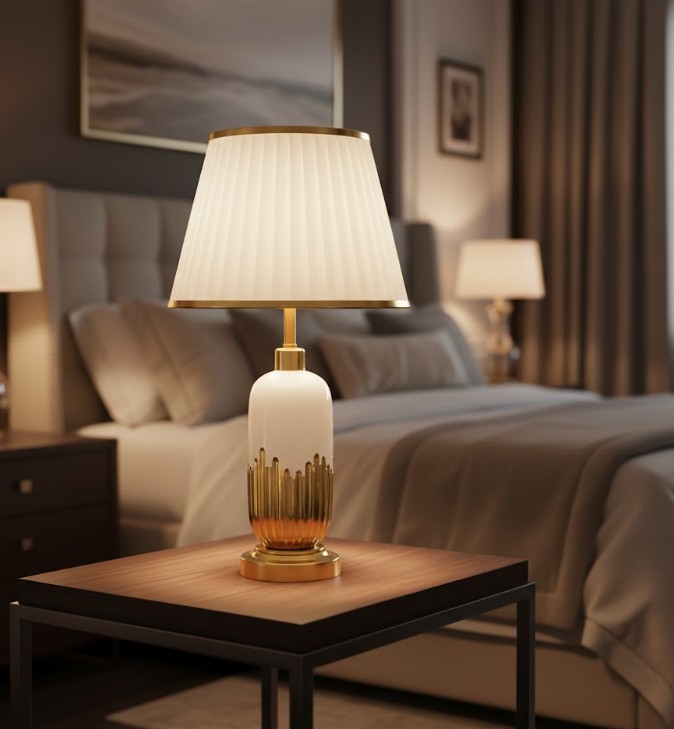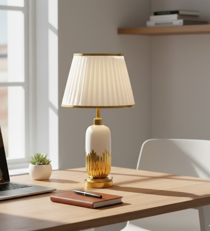Elegant Color Combination – White ceramic body paired with golden metal accents and white fabric shade